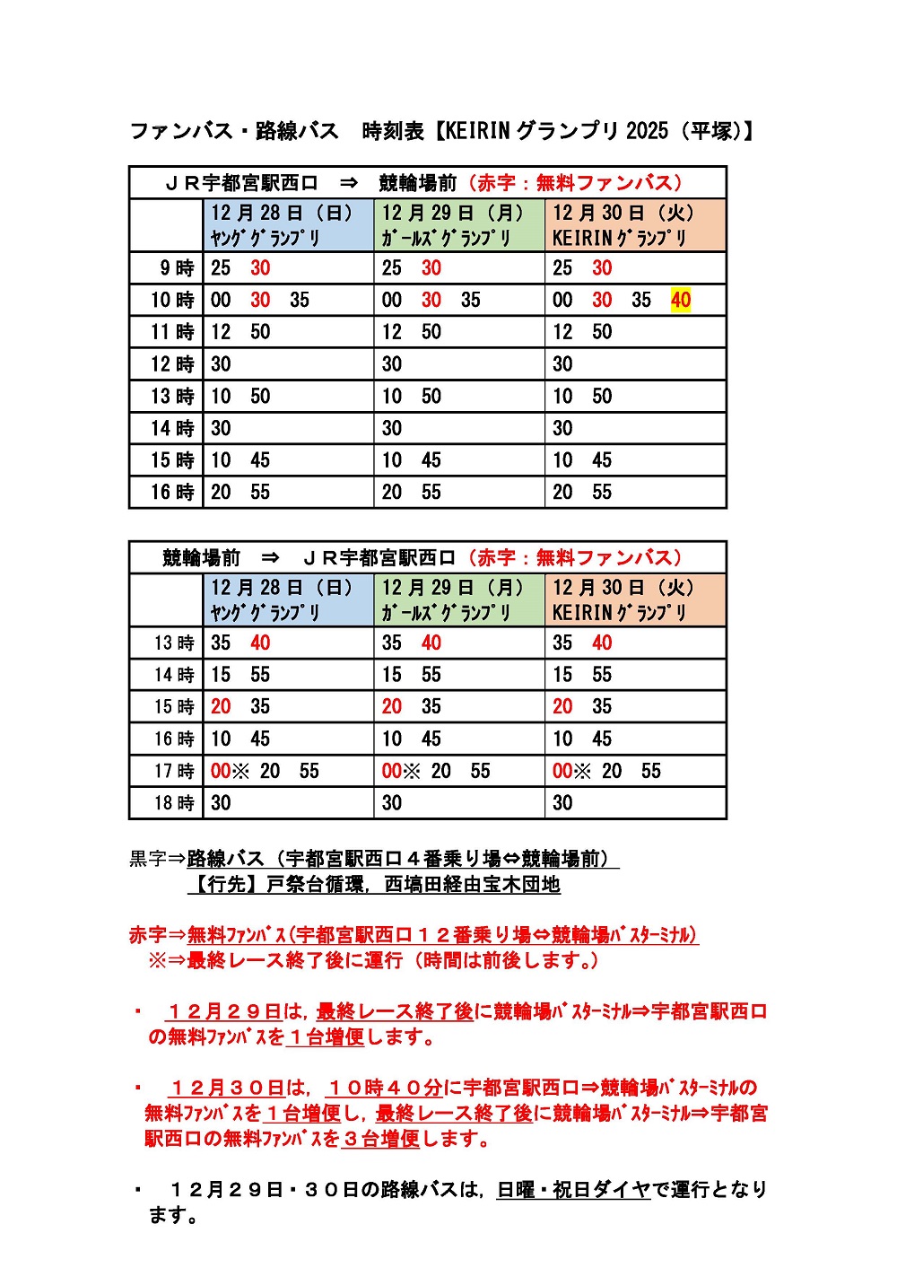 KEIRINグランプリ2025(平塚FI)に伴い,12月29日・30日のファンバスを増便いたします。 また,12月29日・30日の路線バスは,日曜・祝日ダイヤで運行となります。 詳しくは,下記時刻表をご覧ください。 皆様のご来場をお待ちしております。 《時刻表》